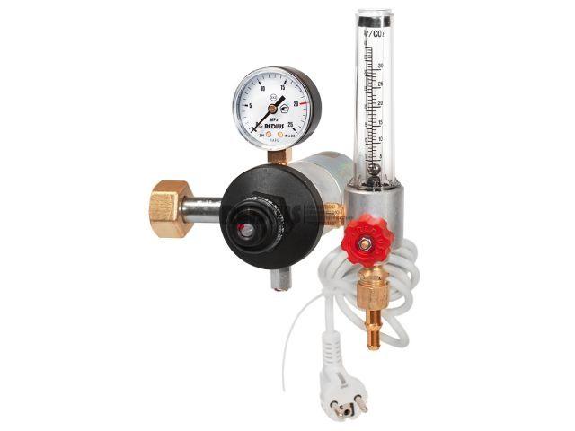 Регулятор расхода баллонный одноступенчатый предназначен для понижения и регулирования давления углекислого газа или аргона, поступающего из баллона, и автоматического поддержания постоянного рабочего расхода газа на выходе регулятора в ходе проведения работ. Подогреватель используется для предотвращения замерзания механизмов редуктора при больших расходах газа или при низких температурах окружающей среды. Подогрев осуществляется за счет теплообмена между газом и горячими стенками корпуса подогревателя.