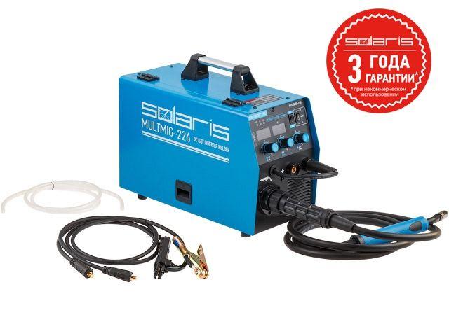 Полуавтомат сварочный SOLARIS MULTIMIG-226, позволяющий варить в режиме полуавтоматической MIG/MAG/FLUX и в режиме ручной дуговой (ММА) сварки. Аппарат оснащен евроразъемом для горелки, возможностью смены полярности для сварки проволокой без газа (FLUX). Аппарат построен с использованием IGBT-транзисторов, обладает набором функций HOT START, ANTISTICK; имеет защиту от перегрева, перегрузки.